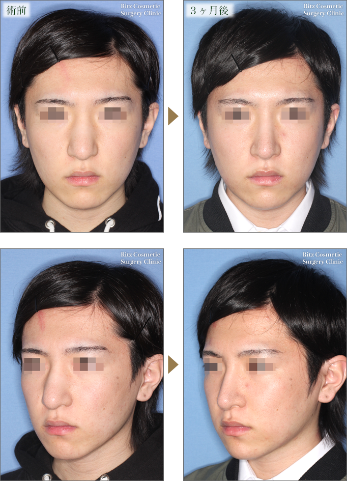 術前は鼻全体が太く、大きい印象が強かった。細い鼻筋を希望された。このような症例では細いプロテーゼを使ってカムフラージュしようとすると、かえって鼻は大きく見えるだけである。手術は鼻骨骨切りが絶対に必要で、鼻根部(眉間近く)まで鼻筋が太いため、外側骨切りに横断骨切りを追加した。術後の鼻筋はほっそりとして、高さも維持されて満足すべき結果となった。